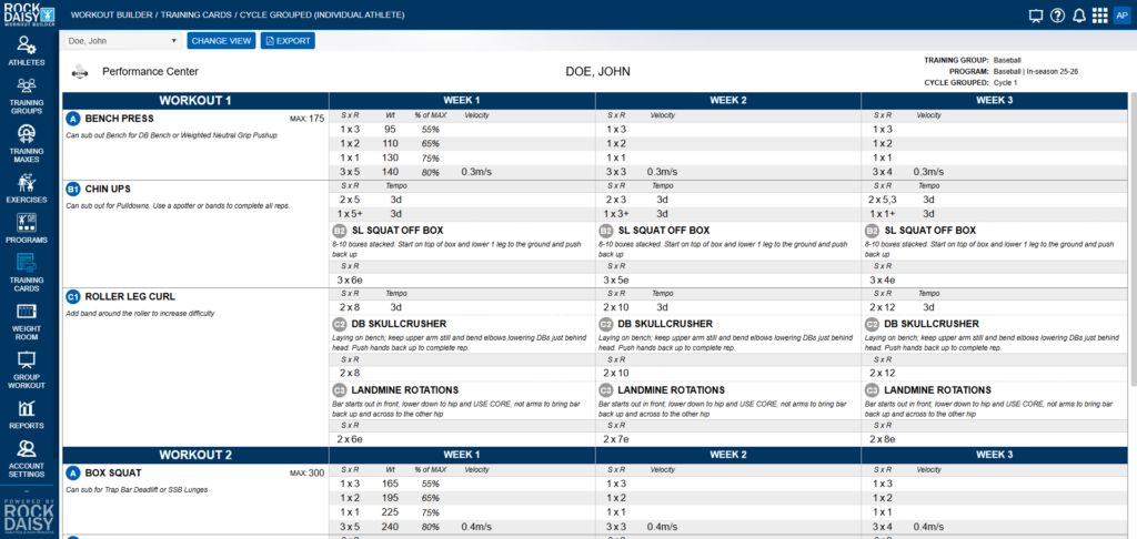 Using RockDaisy AMS and Workout Builder, Coach Fleming delivers a unified training system that scales across 70–100 athletes at a time, while still addressing individual needs by sport, position, age, and training history.